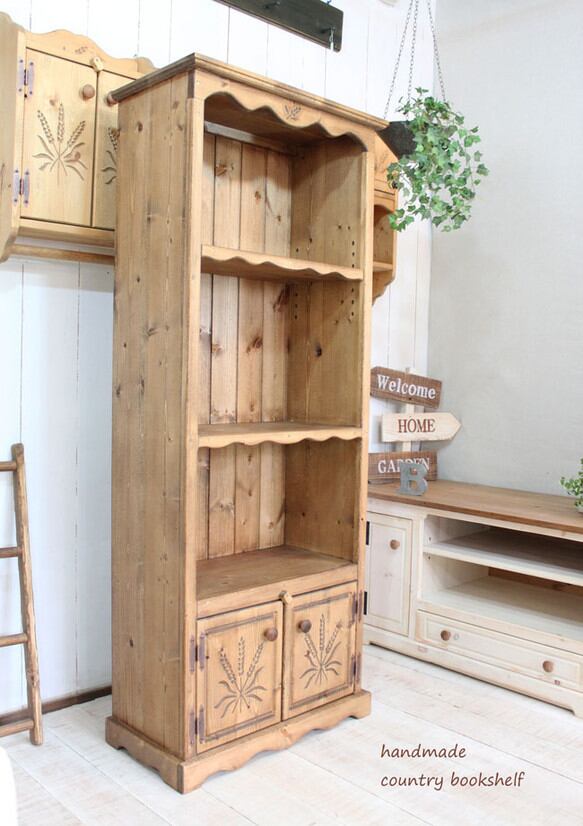 麦穂を彫り込んだ手作りのブックシェルフ、本棚です。