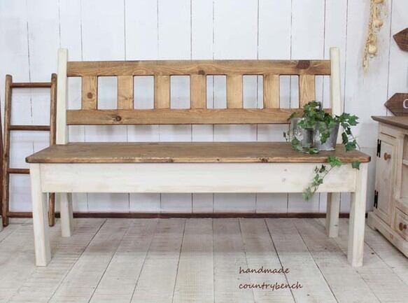 背もたれつきのカントリーベンチです。幅は120センチです。アンティークホワイト仕上げです。