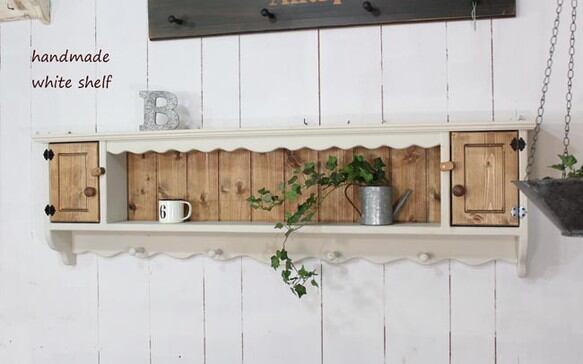 アンティークホワイト風仕上げの壁掛けカントリーロングシェルフです。