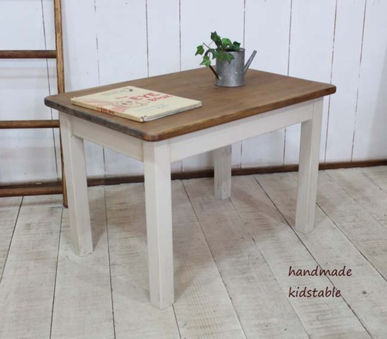 手作りの子供用キッズテーブルです。お絵かきテーブルやおやつ用にもいかがでしょうか。シャビーなアンティークホワイト仕上げです。