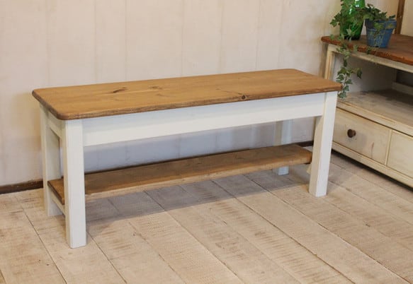 アンティークホワイト風に仕上げた手作りカントリーベンチです。玄関やテラスにもいかがでしょうか。下部に棚板つきです。