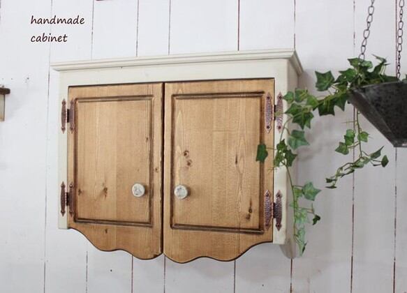 アンティークホワイト風仕上げの扉つきシェルフです。