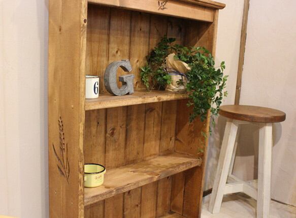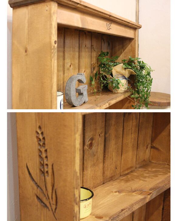 麦の穂を彫り込んだ手作りの飾り棚です。DVDラックにも最適です。または飾り棚やスタンドシェルフ等お好みで使用できます。こちらのお品は落札後の製作になりますので、製作にお時間を少し頂くことになります。(約2~3週間程度)全て手作りで製作しており、丁寧に製作しているつもりですが、無垢の板使用で、反りや割れ、製作時に生じた差し支えのない細かな傷や隙間等あるかもしれません。手作り品をご理解のうえご入札宜しくお願い致します。 グリーン、小物は含みません。
