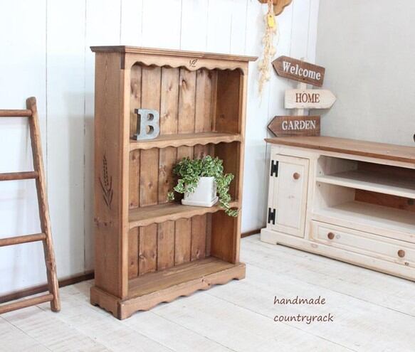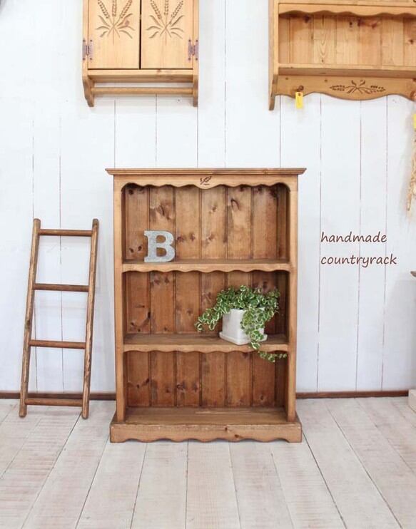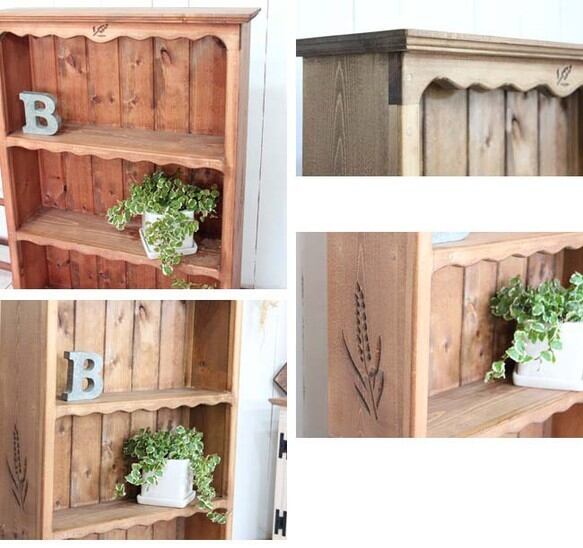 麦の穂を彫り込んだ手作りの飾り棚です。DVDラックにも最適です。または飾り棚やスタンドシェルフ等お好みで使用できます。こちらのお品は落札後の製作になりますので、製作にお時間を少し頂くことになります。(約2~3週間程度)全て手作りで製作しており、丁寧に製作しているつもりですが、無垢の板使用で、反りや割れ、製作時に生じた差し支えのない細かな傷や隙間等あるかもしれません。手作り品をご理解のうえご入札宜しくお願い致します。 グリーン、小物は含みません。