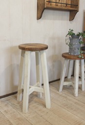 ハンドメイドのアンティーク風スツールです。座面は30ミリ厚の材料を使用しておりますので、厚みがありしっかりしています。アンティーク風仕上げなので、キズやへこみ等ございます。