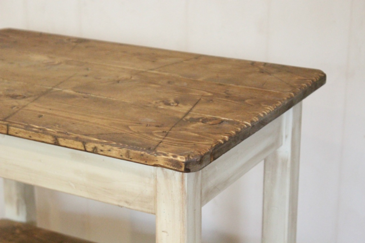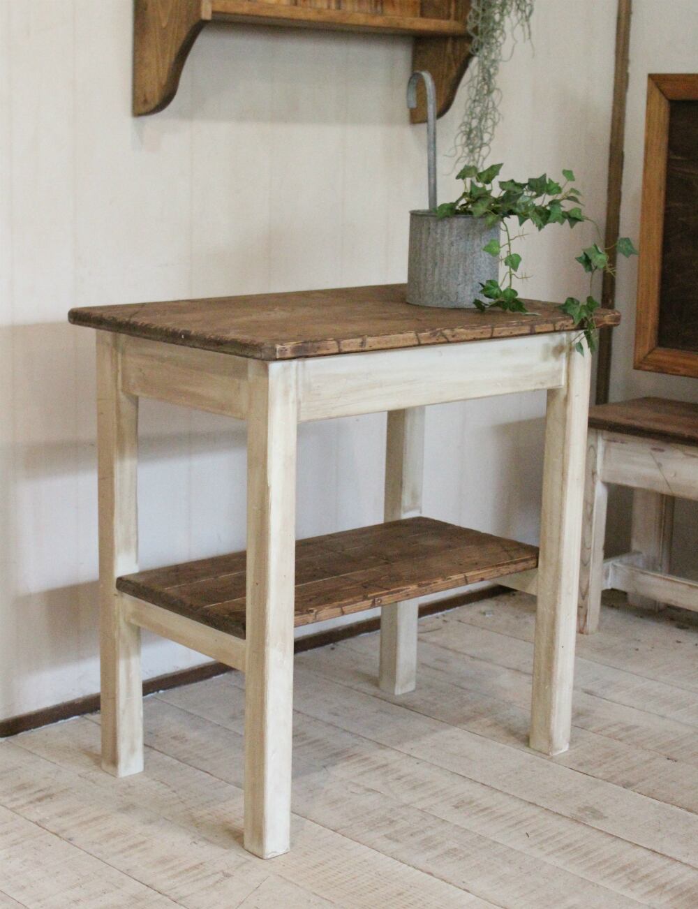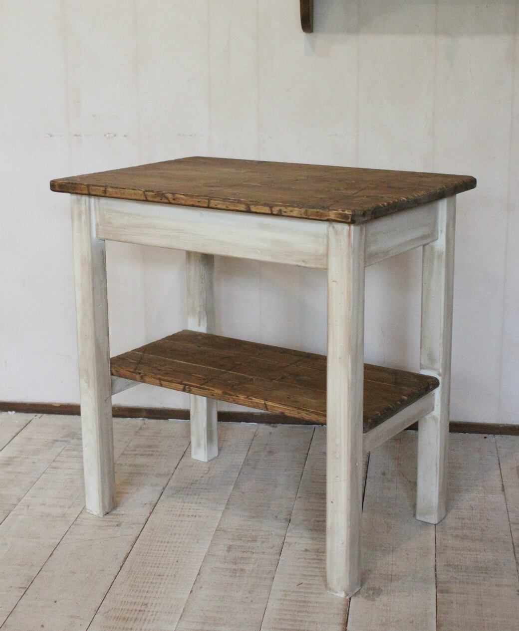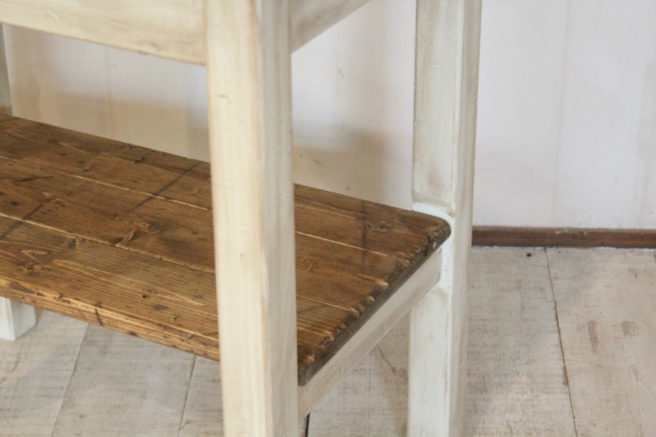 ハンドメイドのシャビーなサイドテーブルラックです。棚板がついています。アンティークホワイト仕上げです。飾り台にもどうぞ。