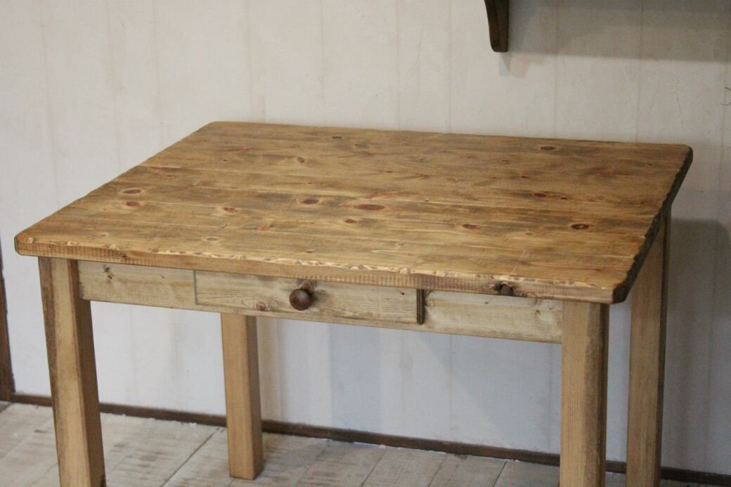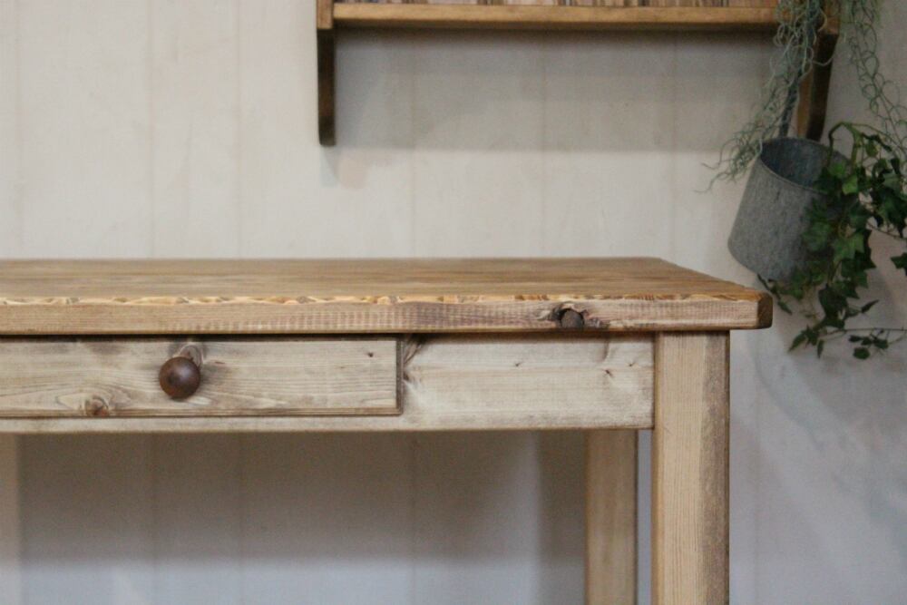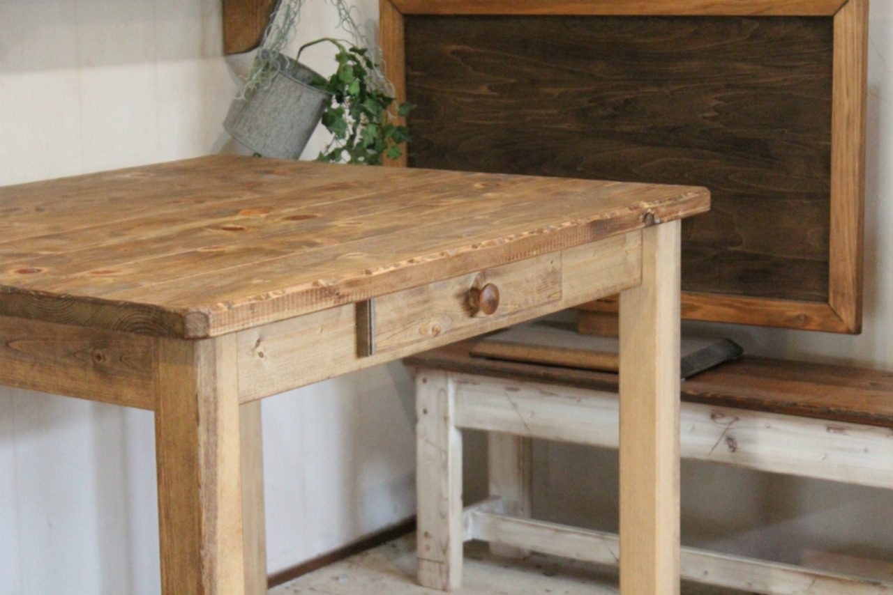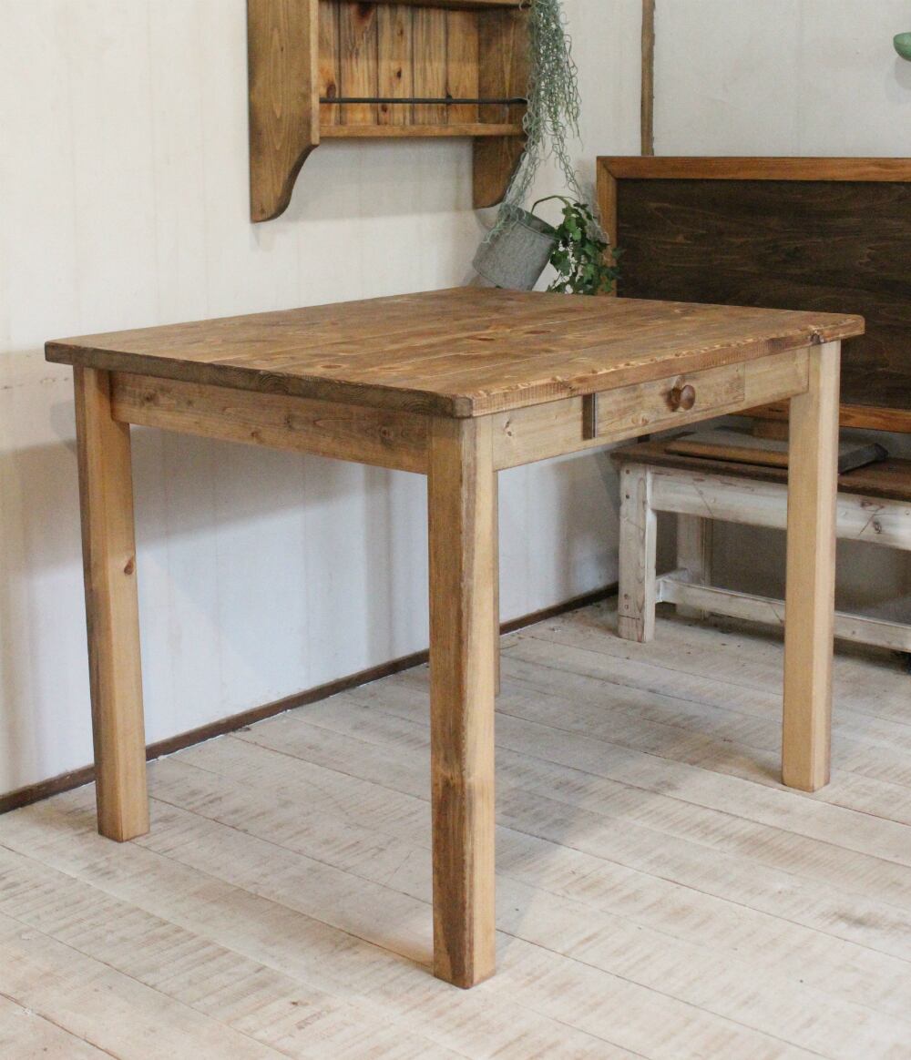 アンティーク風なダイニングテーブルです。引出しがひとつついてます。通常のテーブル天板よりも分厚い天板を使用しているので、ズッシリとした存在感があります。アンティーク風仕上げなので既製品のようなぴかぴかの仕上げではありません。脚は取り外してお送りしますが、工具無しで簡単に取り付けできます。無垢の材料使用で製作しておりますので、丁寧に製作しておりますが差し支えの無い割れや反り、ゆがみ等ある場合、もしくは今後発生する場合があります。こちらのお品は落札後の製作となりますのでお時間を少し(約2~3週間程度)頂く事になります。木目等多少画像と異なります。 ※沖縄、離島は発送不可です。