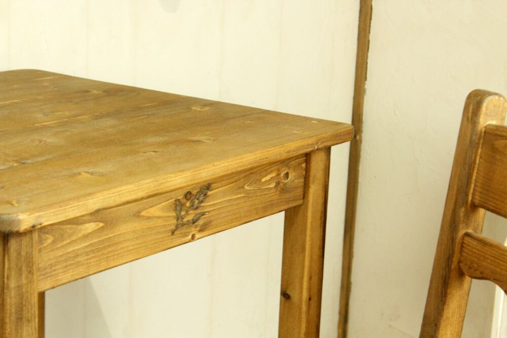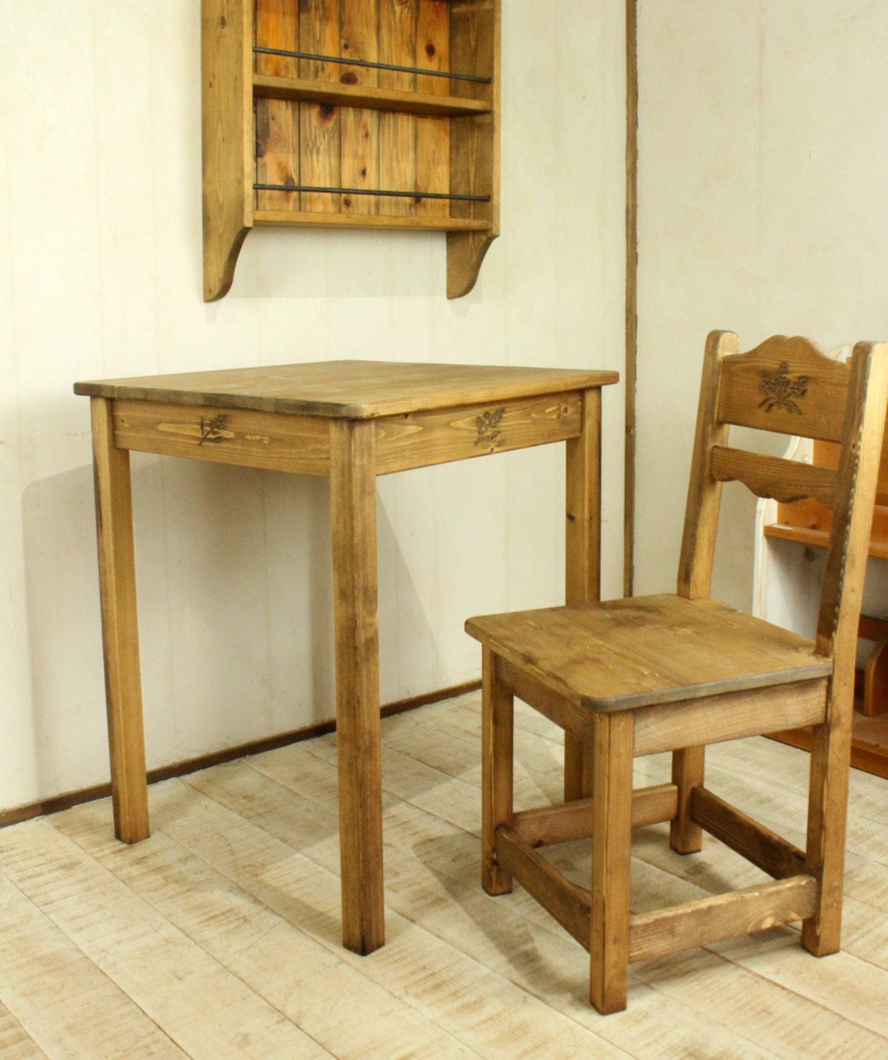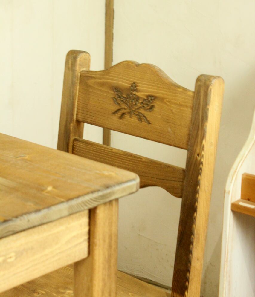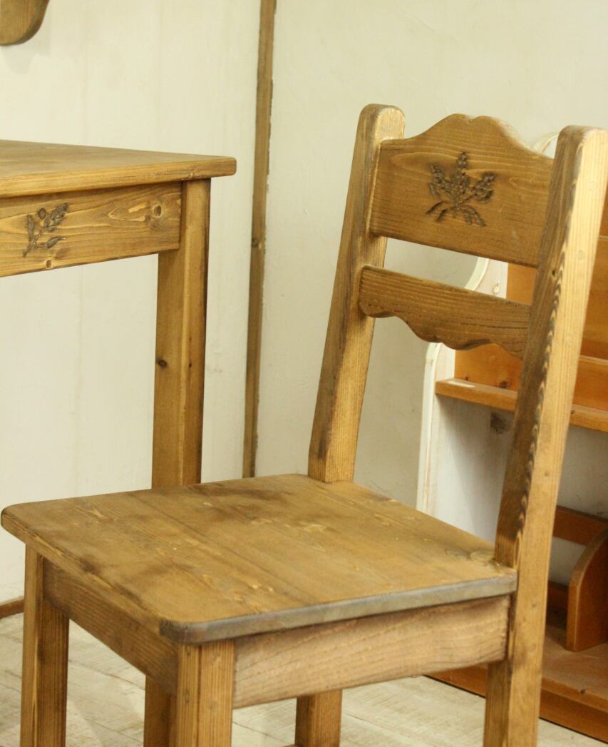 テーブルとイスのセットです。イスの背もたれには麦穂の彫り込みがあります。